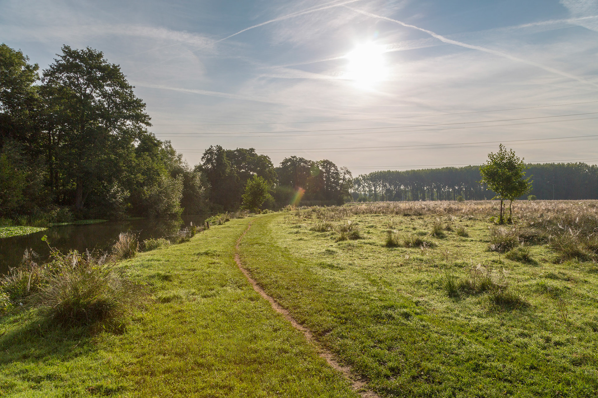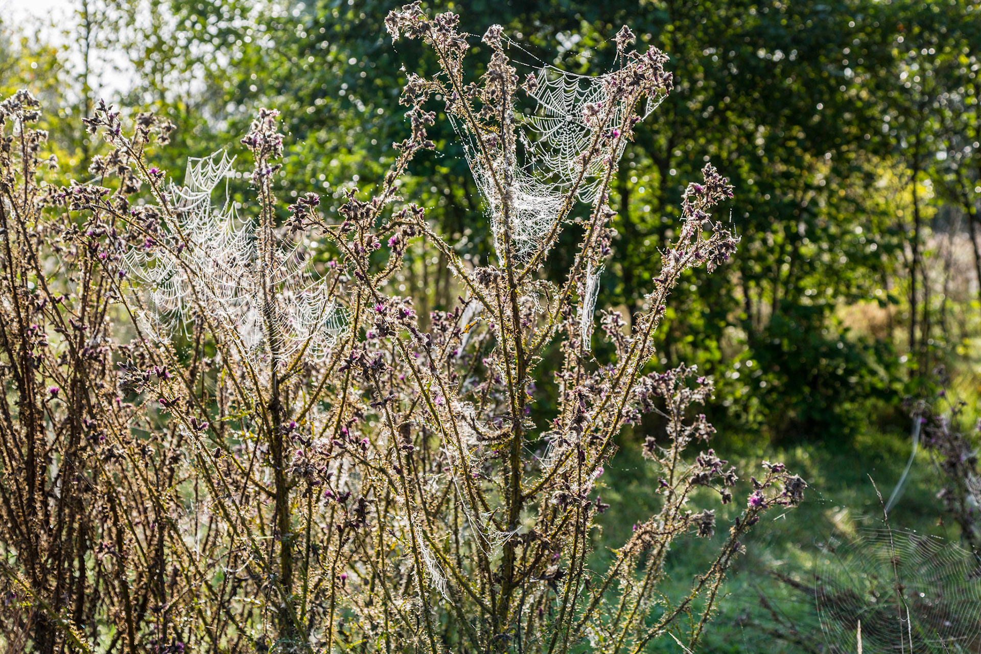 An early morning walk along the Wey Navigation where the thistles were awash with spider webs glistening with the dew.